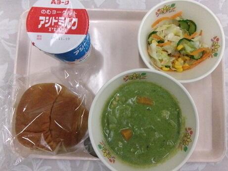ロールパン グリーンシチュー カミカミサラダ 飲むヨーグルト