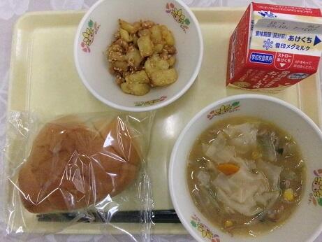 ロールパン みそワンタンスープ 大豆とじゃが芋の甘辛 牛乳