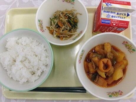 ご飯 イカのチリソースに 炒めナムル 牛乳