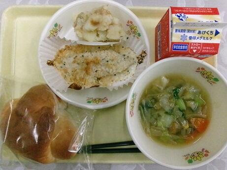 ロールパン 魚のハーブ焼き ジャーマンポテト 野菜スープ 牛乳
