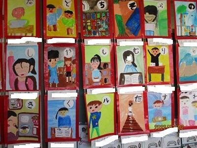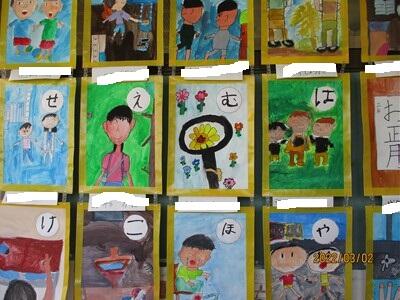 3年生教室前には、かるたの絵札が貼られていました。1年間の学校での出来事がよくわかるかるたです。隅々まで一生懸命に色塗りをしました。