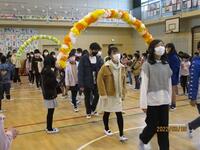 4年生が一つひとつ丁寧に作った花のアーチをくぐって、6年生が入場してきました。1年生が一生懸命に拍手をしています。2年生以上の教室では、オンラインでその様子を見ながら拍手している子ども達の姿がありました。