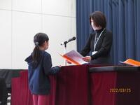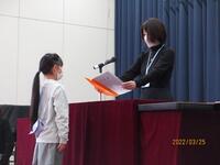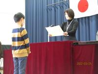 令和3年度の修了式の後は、表彰式がありました。座間市青少年芸術祭で奨励賞、読書感想画中央コンクールで入選、明るい選挙標語で佳作、入選、最優秀賞を受賞した子達が表彰されました。