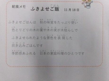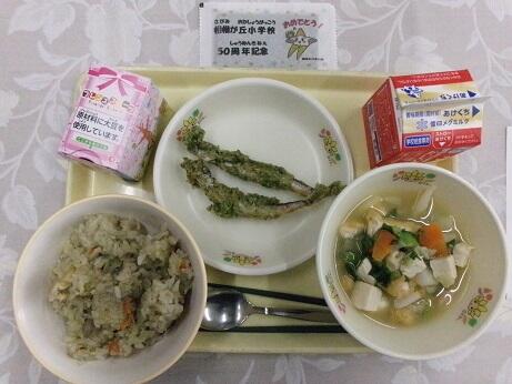 吹きよせご飯 ししゃもの磯部揚げ かぶのみそ汁 牛乳 お楽しみデザート のり