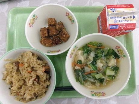 ご飯 チキンチキンごぼう 五目スープ 牛乳