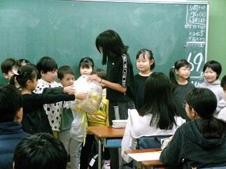 日頃から6年生にお世話になっている1年生が、感謝の気持ちをこめて、てるてる坊主のプレゼントに来ていました。
