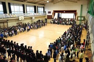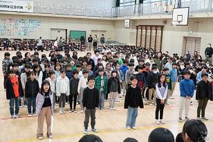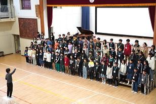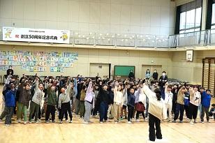 50周年記念式典で全校で歌った「For dicades」をみんなで歌う中、6年生が入場し、送る会が始まりました。