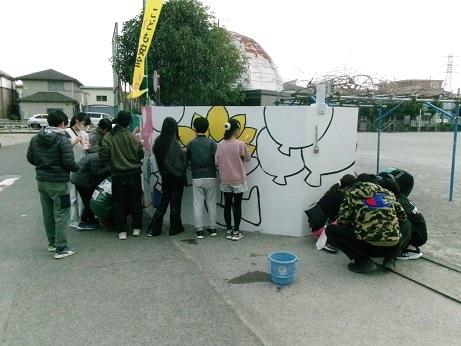 6年生が、本杉教諭が描いた下絵にペンキを塗ってくれます。