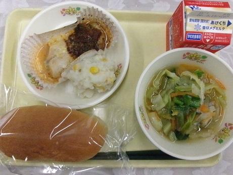 コッペパン チキンスープ さわらのピザソース焼き コーンポテト 牛乳