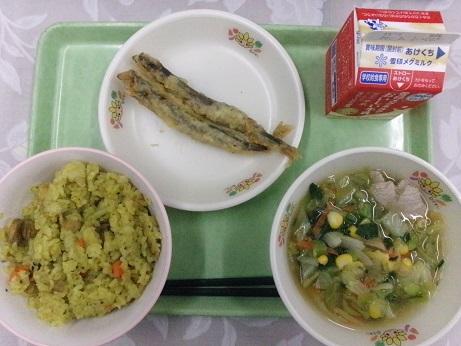 カレーピラフ ししゃものからあげ 野菜スープ 牛乳