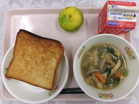 ガーリックトースト 根菜ごまじる みかん 牛乳