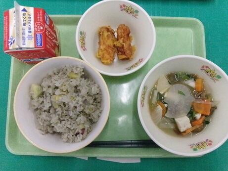 サツマイモご飯 なめこ汁 ちくわのもみじあげ 牛乳